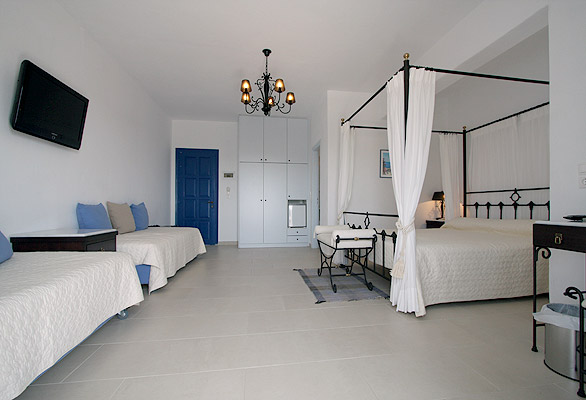 allocated in 4 buildings. The main building disposes of an air-conditioned restaurant with 65 seats, a restaurant outside with 30 seats and very nice view of the swimming pool, Parikia town, Port and the sea.